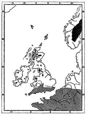 A map from a later publication (1863) shows the southern limit of the region of submergence to which Lyell alluded in 1840 -- the “boulder clay” is to be found in the white (submerged) region and the striped region was not submerged at this time. The darker areas are mountains.