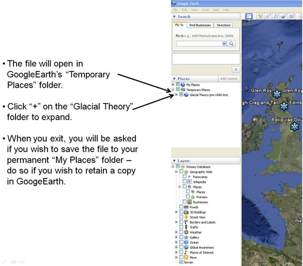 1. Install GoogleEarth on your computer. 2. You may also download the program-data file that contains the tour and save it on your computer for future use. You will be able to open and run this file on your own. (Elsewise, you will need to be online to use the appropriate links in this website.) 3. When using Google Earth: